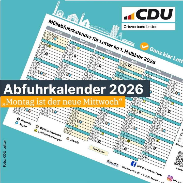 mehr🗑️ Müllabfuhrkalender ? Montag ist der neue Mittwoch!Ja, wir sind dieses Mal etwas spät dran ⏰ ? die offiziellen Abfuhrtermine wurden leider erst vor zwei Tagen bekanntgegeben. Die Erstellung erfolgt kurzfristig, die Verteilung schließt sich dann sofort an ? bitte haben Sie Verständnis, da wir alle ehrenamtlich engagiert sind und unsere Aufgaben stets gewissenhaft erledigen.📌 Wichtige Info vorab: Leichtverpackungen (Gelbe Tonne/Gelber Sack) werden ab 2026 montags statt mittwochs abgeholt. 👉 Am 14-tägigen Abfuhrrhythmus ändert sich nichts.📥 Wer nicht warten möchte, bis der Kalender im Briefkasten landet, kann sich bereits jetzt ein Exemplar auf unserer Homepage herunterladen: 🌐 www.cdu-letter.de (Downloadbereich)Vielen Dank für Ihre Geduld!#cdu #cduletter #cduseelze #seelze #sauberkeit #abfuhrkalender