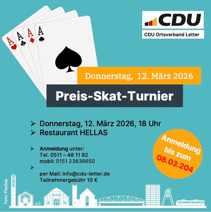 ♠️ Preis-Skat-Turnier 2026 ? Jetzt anmelden! ♣️Die CDU Letter lädt herzlich zum traditionellen Preis-Skat-Turnier ein!📅 Donnerstag, 12.03.2026🕕 Beginn: 18:00 Uhr📍 Restaurant HELLAS📝 Anmeldung bis 08.03.2026:☎️ 0511 ? 48 11 82📱 0151 ? 23836650📧 info@cdu-letter.de💶 Startgeld: 10 ?Meldet euch gern gemeinsam mit Freunden an ? wir freuen uns auf einen spannenden, geselligen Skat-Abend mit euch! 😊♠️