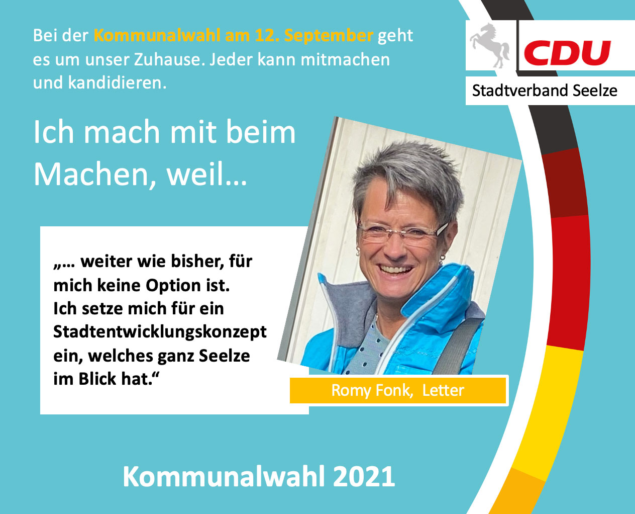 Wir vom CDU Ortsverband Letter unterstützen die Kampagne „Ich mach mit beim Machen“, bei der wir Ihnen unsere aktiven Stadtratsmitglieder und Kandidaten vorstellen. In einem kurzen Statement erklären sie HIER, warum sie sich ehrenamtlich in der Kommunalpolitik, DER Zukunft unserer Stadt, engagieren. Am 12. September findet die Kommunalwahl statt, MACHEN SIE MIT und seien Sie dabei.