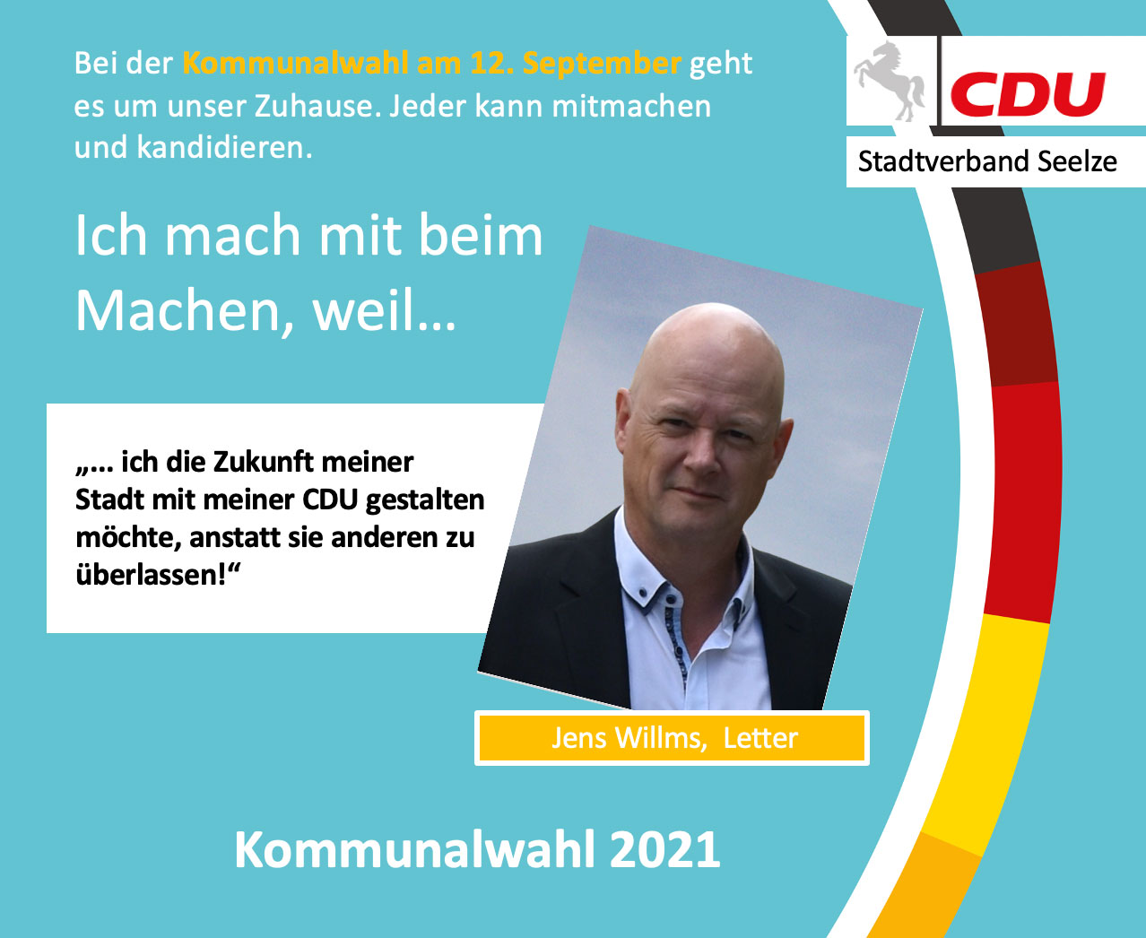Wir vom CDU Ortsverband Letter unterstützen die Kampagne „Ich mach mit beim Machen“, bei der wir Ihnen unsere aktiven Stadtratsmitglieder und Kandidaten vorstellen. In einem kurzen Statement erklären sie HIER, warum sie sich ehrenamtlich in der Kommunalpolitik, DER Zukunft unserer Stadt, engagieren. Am 12. September findet die Kommunalwahl statt, MACHEN SIE MIT und seien Sie dabei.